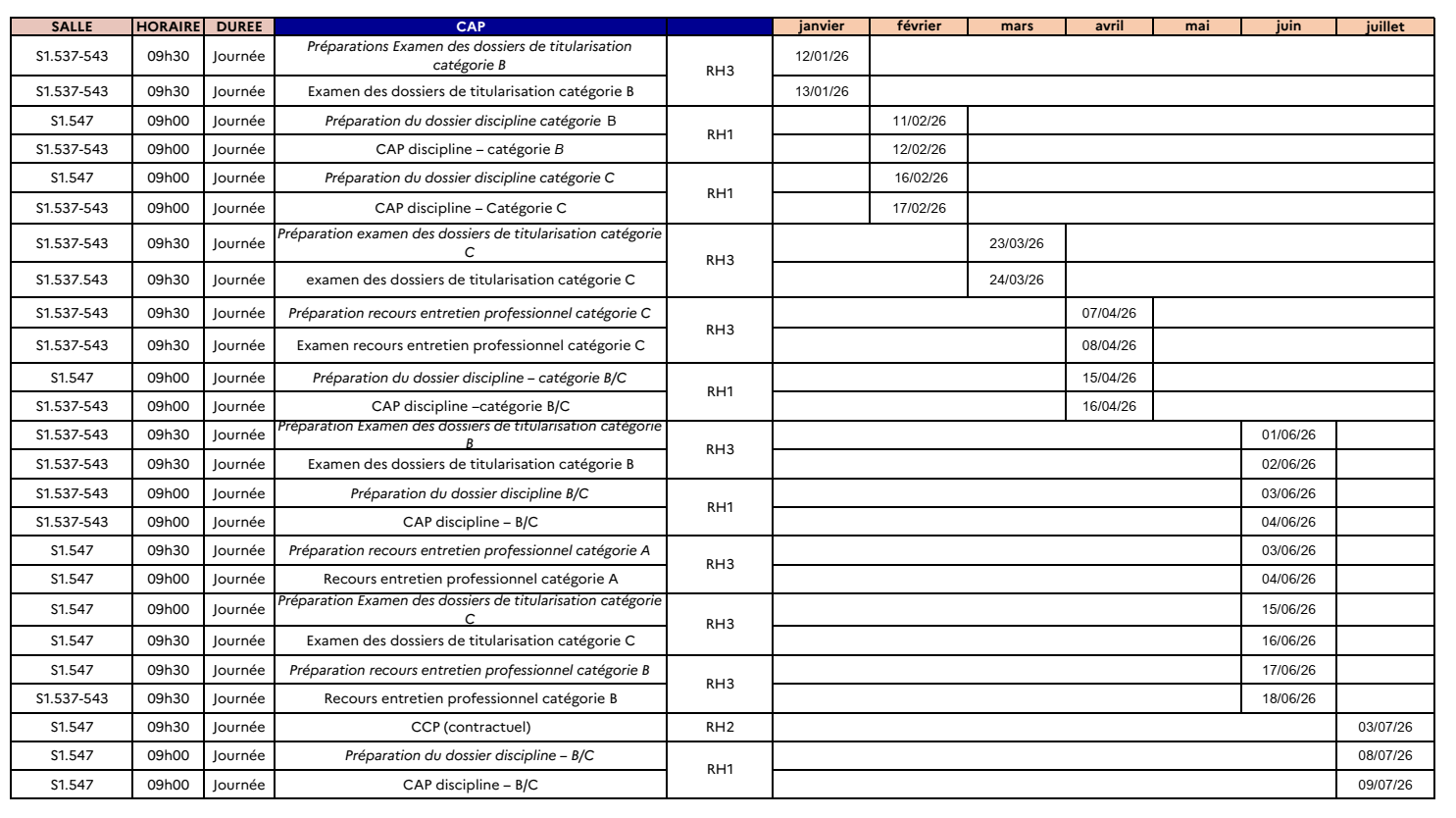 Instances nationales prévues à la DG au premier semestre 2026 :