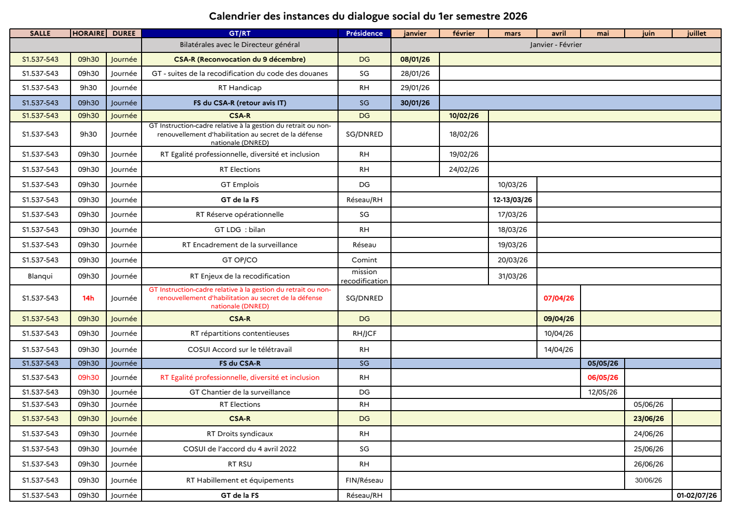 Instances nationales prévues à la DG au premier semestre 2026 :